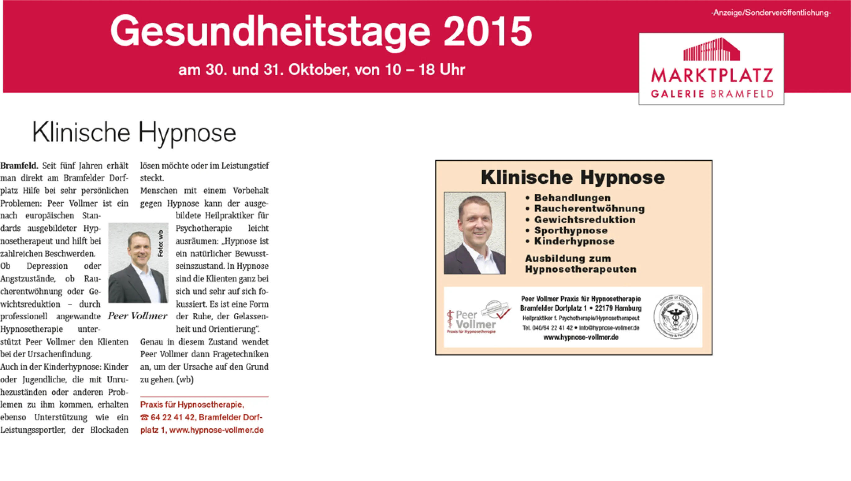 Mein Name ist Peer Vollmer und ich bin Hypnosetherapeut mit eigenen Praxisräumen in Hamburg-Bramfeld. Neben der Hypnosetherapie für die unterschiedlichsten Bereiche biete ich auch Seminare und Workshops an. Erfahre mehr über Methoden und Anwendungen der Hypnose – oder frag mich einfach persönlich!